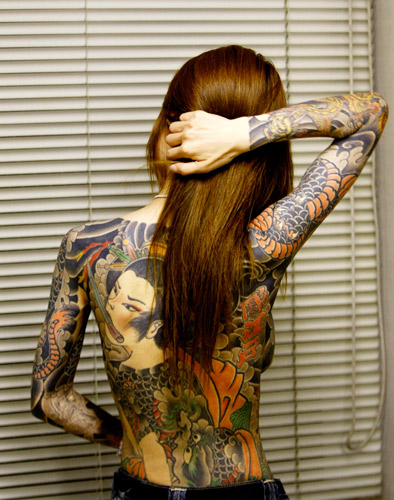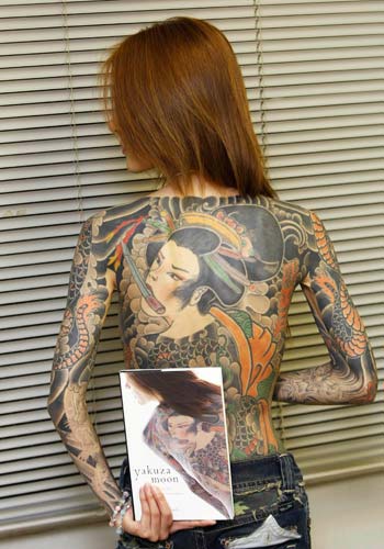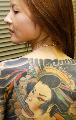 天藤湘子从外表看和如今众多时髦的日本女杏没有什么两样,染着棕色的头发身穿紧身牛仔裤。但是当她褪去衬衫,露出来的竟然是通体的纹身。父亲是日本黑社会成员,她本人年轻时也曾加入过黑帮并服用过*。细看她的纹身那是精雕细刻的龙、凤和一个中世纪的日本艺伎,艺伎的嘴里含着一把尖刀。这纹身刻画的就是天藤儿时和年轻时生活的写照。