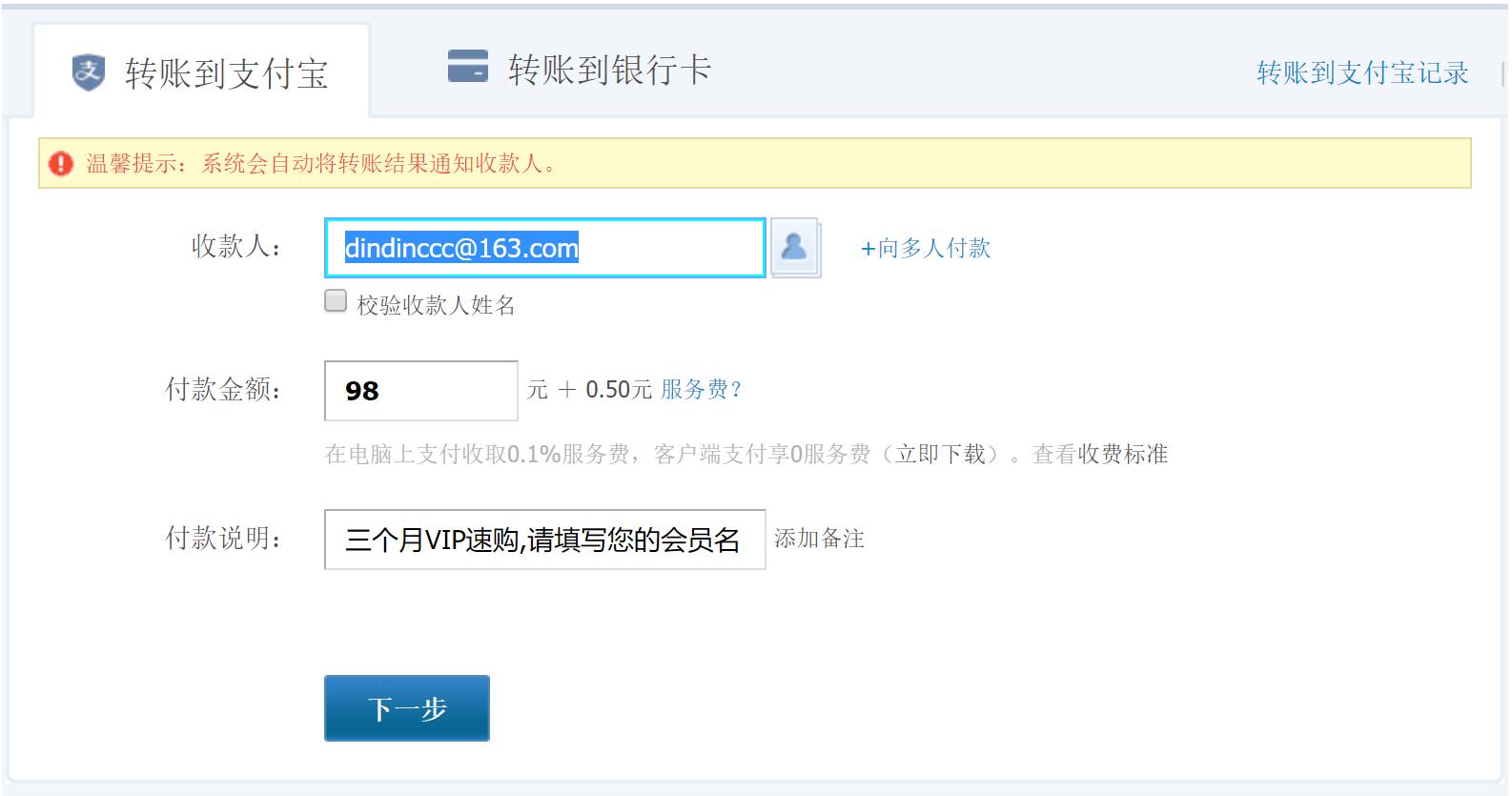 进入支付页面后,直接填写98元三个月会员(终身版填写599元),付款成功后,即可开通! 格式如下:(以下是您付款的资料,请勿填写错误。)